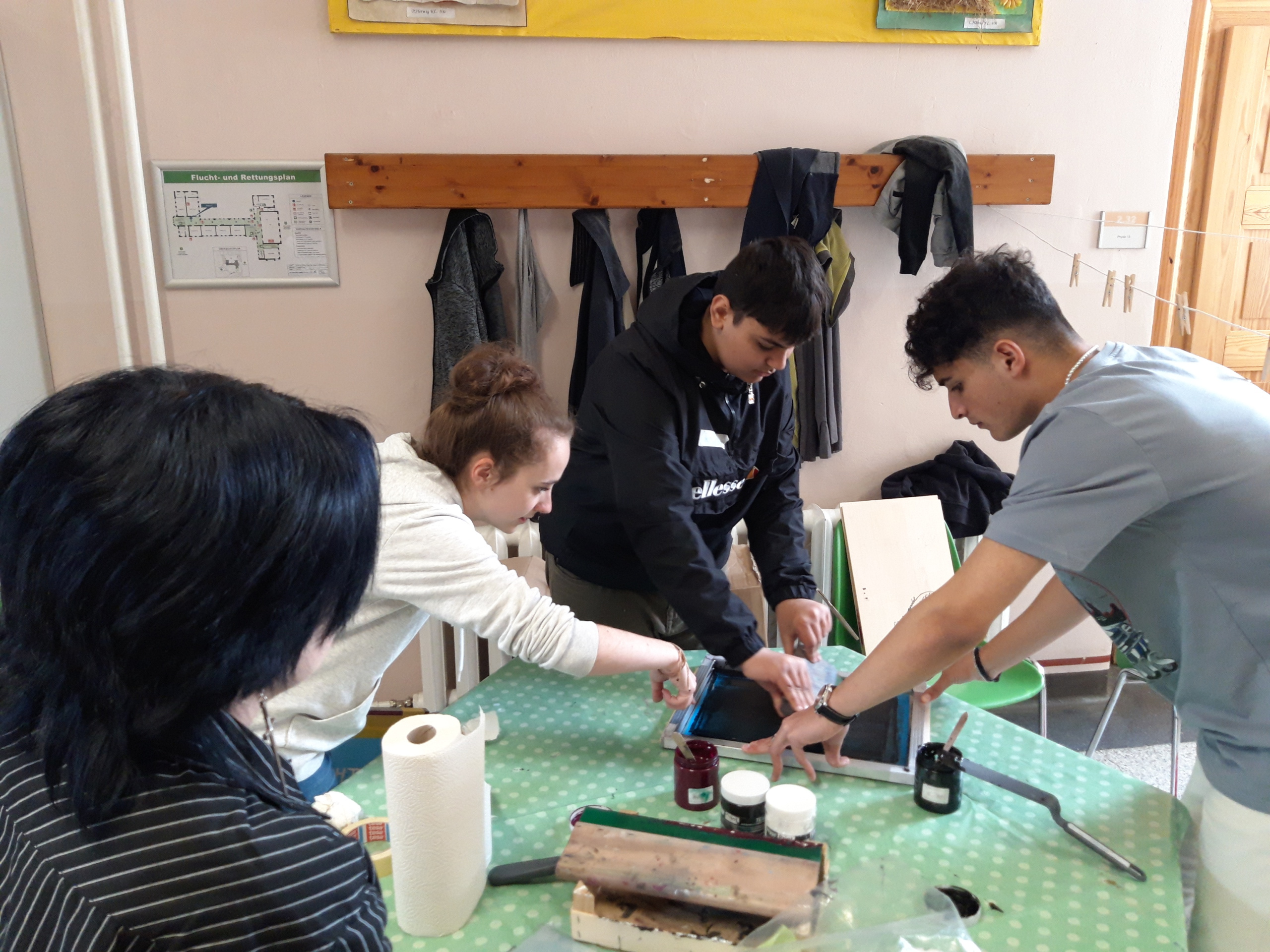 Dann wurden wir in zwei Gruppen eingeteilt, die 1. Gruppe ist raus gegangen in den Gang und hat alte T-Shirts mit verschiedenen Motiven bedruckt z.B. ein Schiff, ein Pandabär usw.