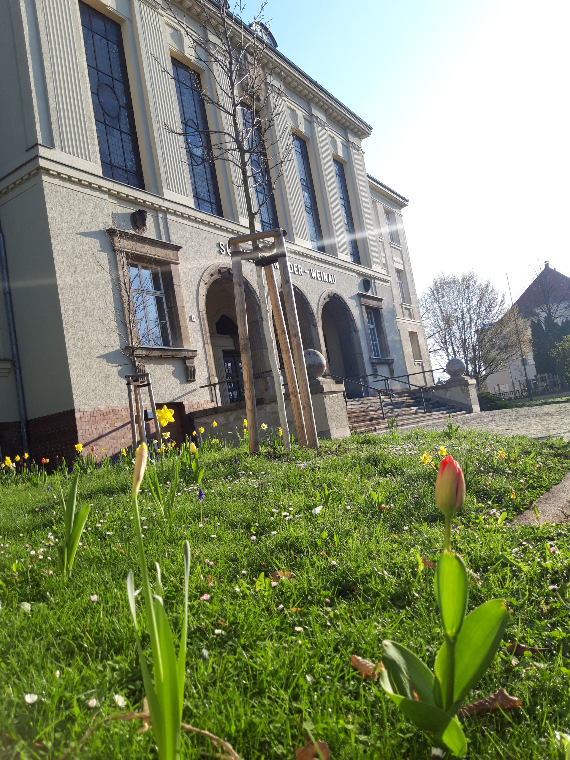 Wer seinen Schulweg gerade mit offenen Augen bestreitet, wird es längst bemerkt haben: die wärmenden Sonnenstrahlen der letzten Tage haben dazu geführt, dass die im Herbst von unserer Schülerinen und Schülern auf der Grünfläche neben dem Haupteingang gesteckten Frühblüherzwiebeln zum Leben erwacht sind. Und so können sich in den nächsten Tagen nicht nur die Insekten über zusätzliche Nahrungsquellen freuen, sondern auch wir uns an der bunten Farbenpracht.