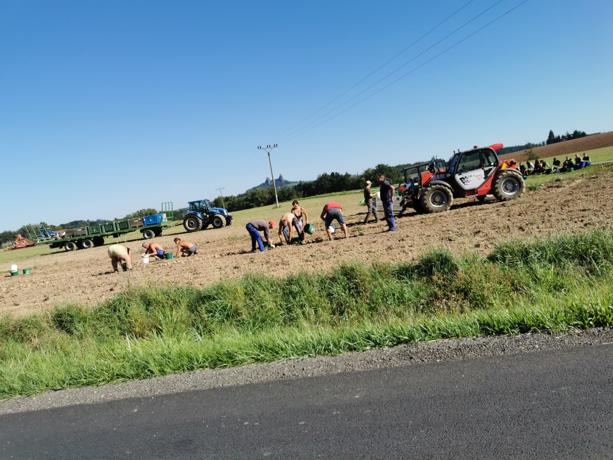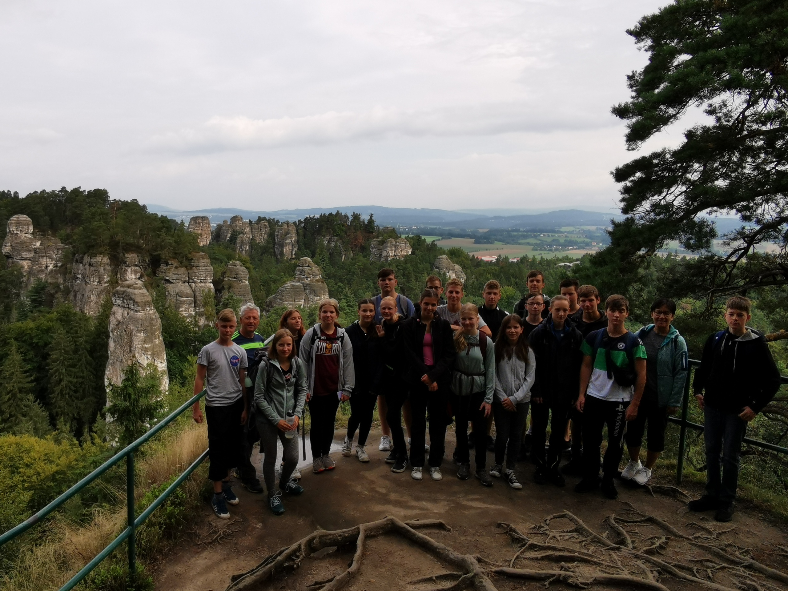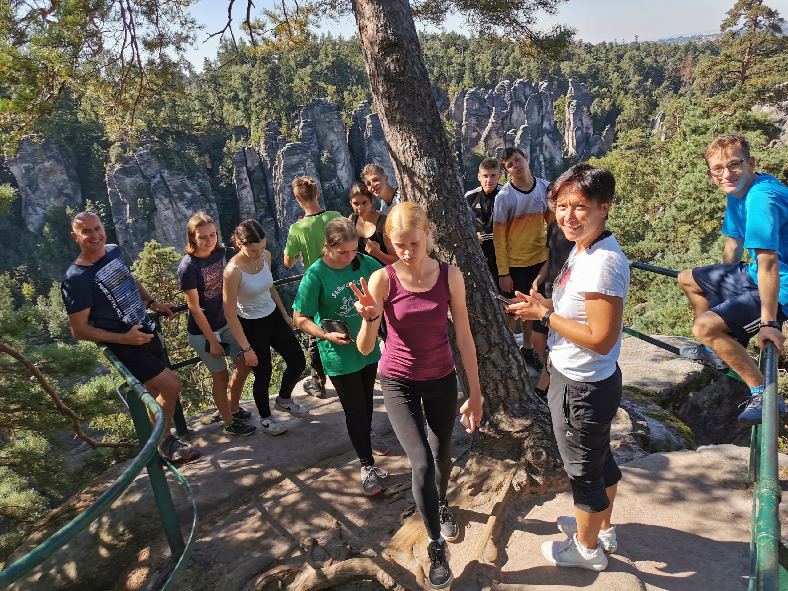 In diesem Jahr stand unser Touristiklager unter dem Motto „Nachhaltigkeit“ und wir haben bewusst darauf geachtet, unsere Tour so umweltfreundlich wie möglich zu gestalten. Dies beinhaltete unter anderem die bewusste Mülltrennung vor Ort (dies ist in Tschechien noch nicht so verbreitet wie bei uns) und die Betonung von Fahrrädern als umweltfreundliches Fortbewegungsmittel. Der Kleinbus blieb die gesamte Woche stehen und täglich mussten frühmorgens zwei Schüler die fünf Kilometer hinunter ins nächste Dorf mit dem Rad zurücklegen, um frische Brötchen zu holen. Obwohl auch in Tschechien die langen Sommerferien schon beendet waren, herrschte an den Prachovske skaly heftiger Andrang und die Teilnehmer diskutierten die Frage, wieviele Touristen eine Destination aushält ohne Schaden zu nehmen. Auch Unterschiede von extensiver und intensiver Landwirtschaft konnten wir unterwegs beobachten, so beispielsweise die Ernte per Hand.