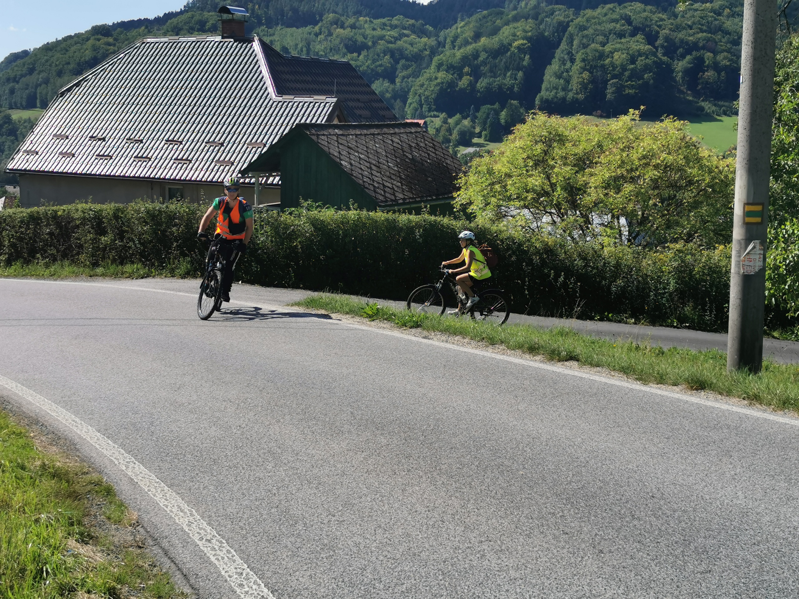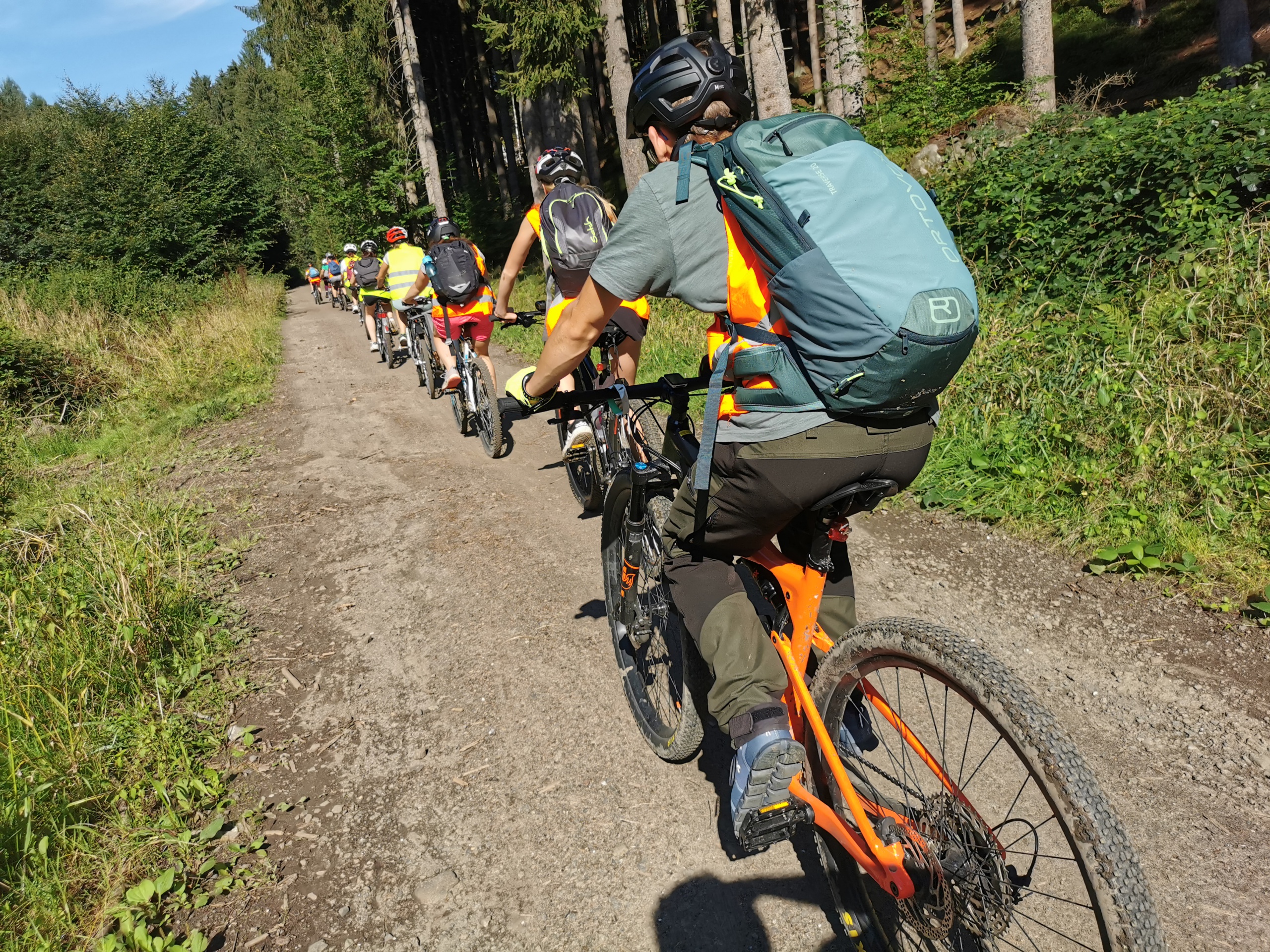Die Hinfahrt führte uns über stolze 70 Kilometer und ca. 1000 Höhenmeter und wir starteten voller Vorfreude in diese einwöchige Tour. Spätestens an den ersten Anstiegen wandelte sich diese Freude bei einigen zumindest in Skepsis, die bei der nächsten Abfahrt aber sofort wieder verflog. Die Verpflegung unterwegs wurde dank unseres städtischen Begleitbusses sichergestellt, der uns auf dem Hin- und Rückweg immer mit ausreichend Proviant und Flüssigkeit versorgte.