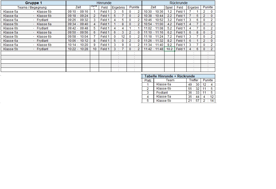 Insgesamt traten vier gemischte Mannschaften der Klassenstufen 5 und 6 sowie die Mädchenmannschaft aus Frydlant gegeneinander an. Die Spiele waren äußerst spannend und brachten die Teilnehmer an ihre sportlichen Grenzen. Besonders die 6a konnte sich am Ende über einen knappen Sieg freuen. Doch auch die Mannschaften der 6b und die Gäste aus Frydlant lieferten hervorragende Leistungen ab und erreichten punktgleich den zweiten und dritten Platz. Auch die Leistung unserer Nachwuchshoffnungen aus den 5. Klassen konnten sich sehen lassen, immerhin mussten sie gegen die körperlich robusteren Teams antreten.