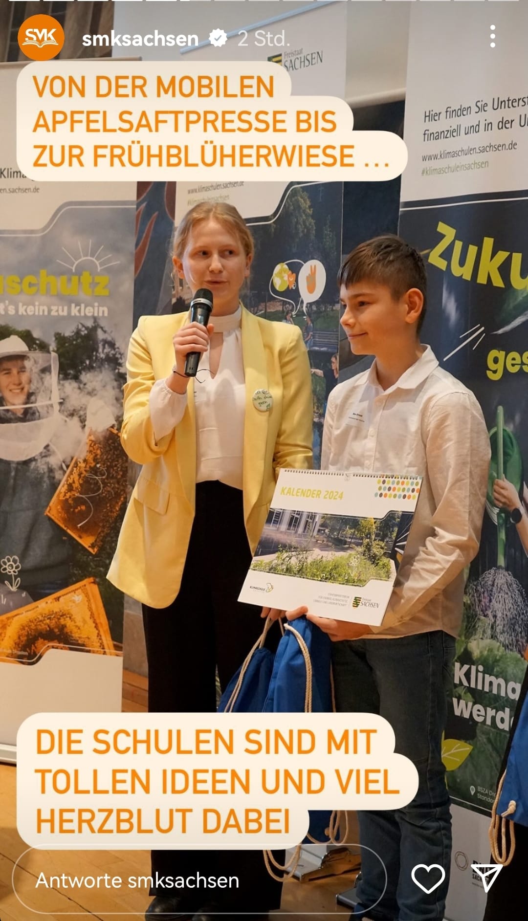 Am 1. Februar 2024 wurde unserer Schule im Rahmen der jährlich stattfindenden Klimaschulkonferenz in Dresden erneut der Titel „Klimaschule“ verliehen.