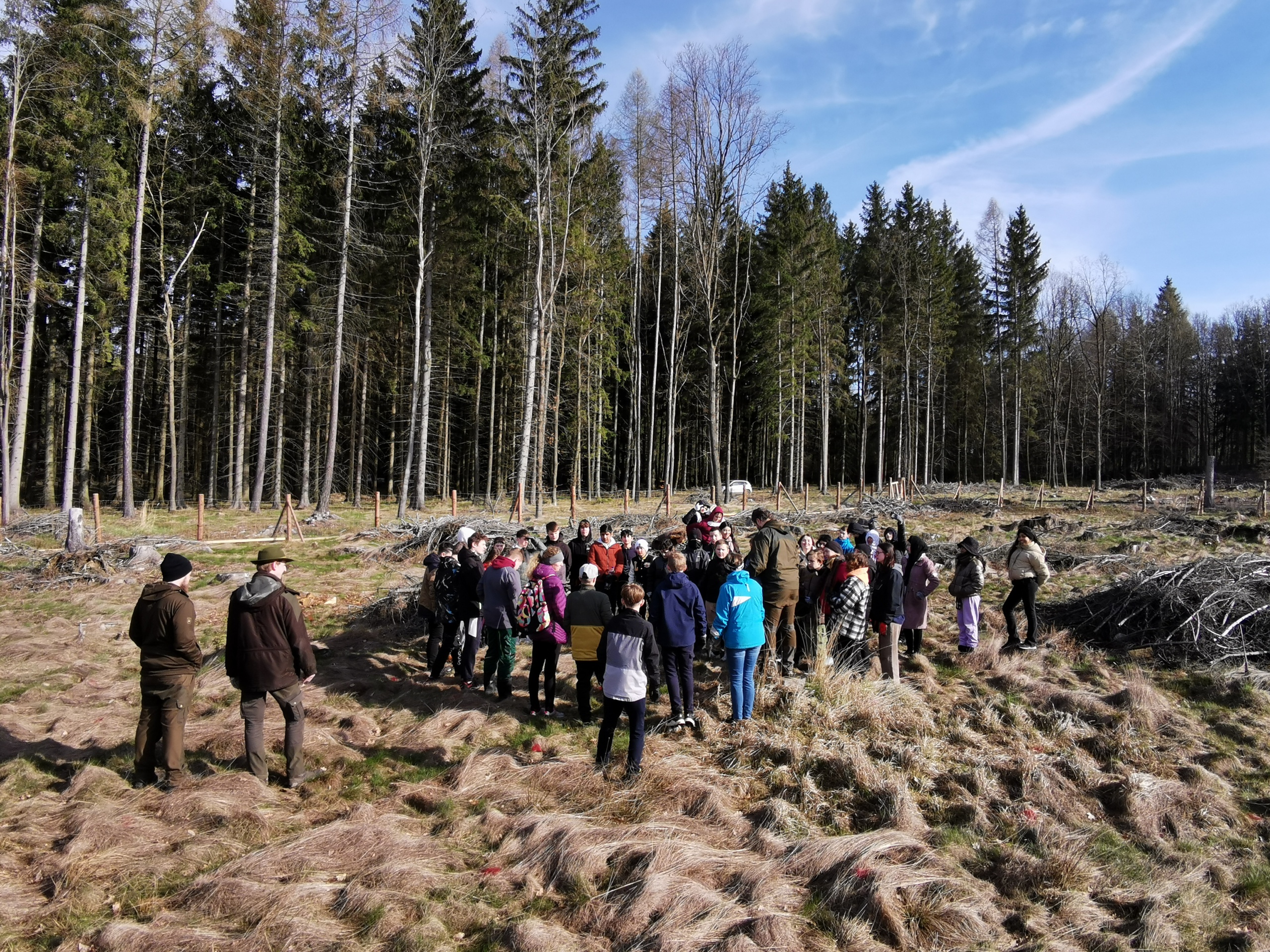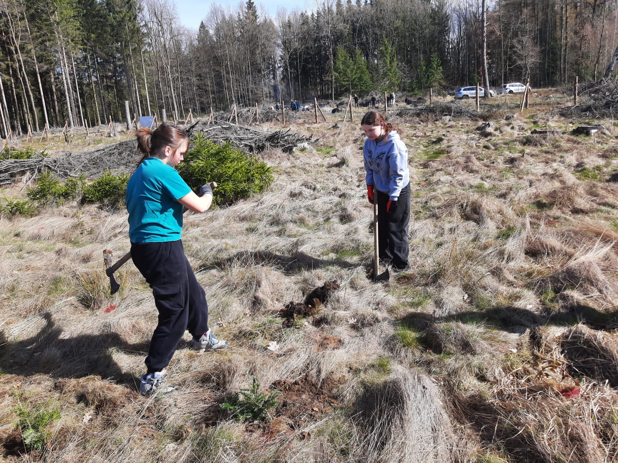 Die Aktion begann mit einer kurzen theoretischen Einführung durch die Herren Kratochvil und Klatovsky – Mitarbeiter von Lesy ČR – um das Verständnis für die Bedeutung von Wald und Umweltschutz zu vertiefen. Anschließend machten sich die Schülerinnen und Schüler an die Arbeit: Sie hackten mühsam Löcher an den markierten Stellen, setzten die jungen Tannen ein und verdichteten den Boden um sie herum. Es war eine körperlich sehr anstrengende Aufgabe, aber die Schülerinnen und Schüler empfanden es als äußerst erfüllend, einen konkreten Beitrag zum Schutz unserer Umwelt zu leisten.