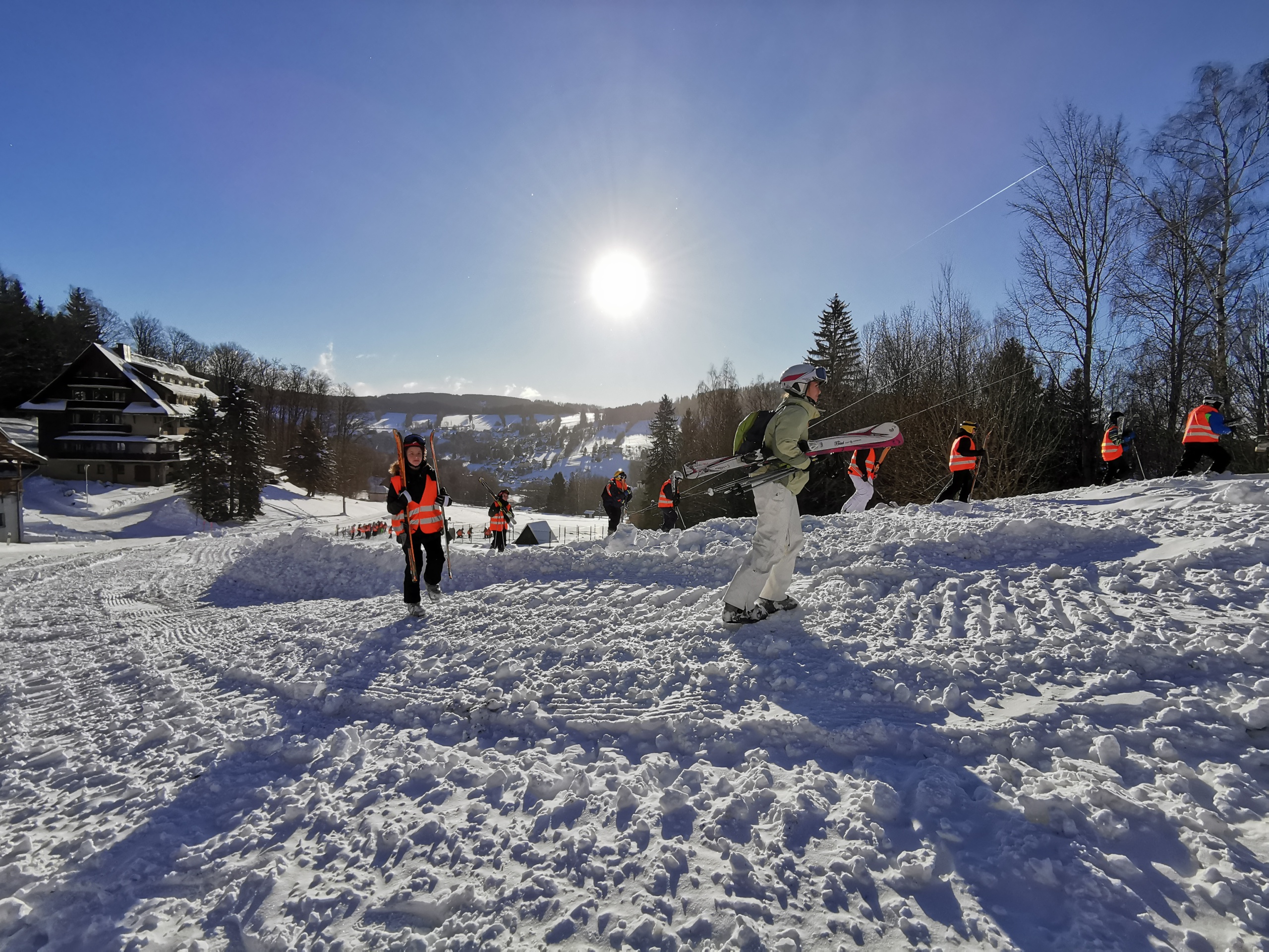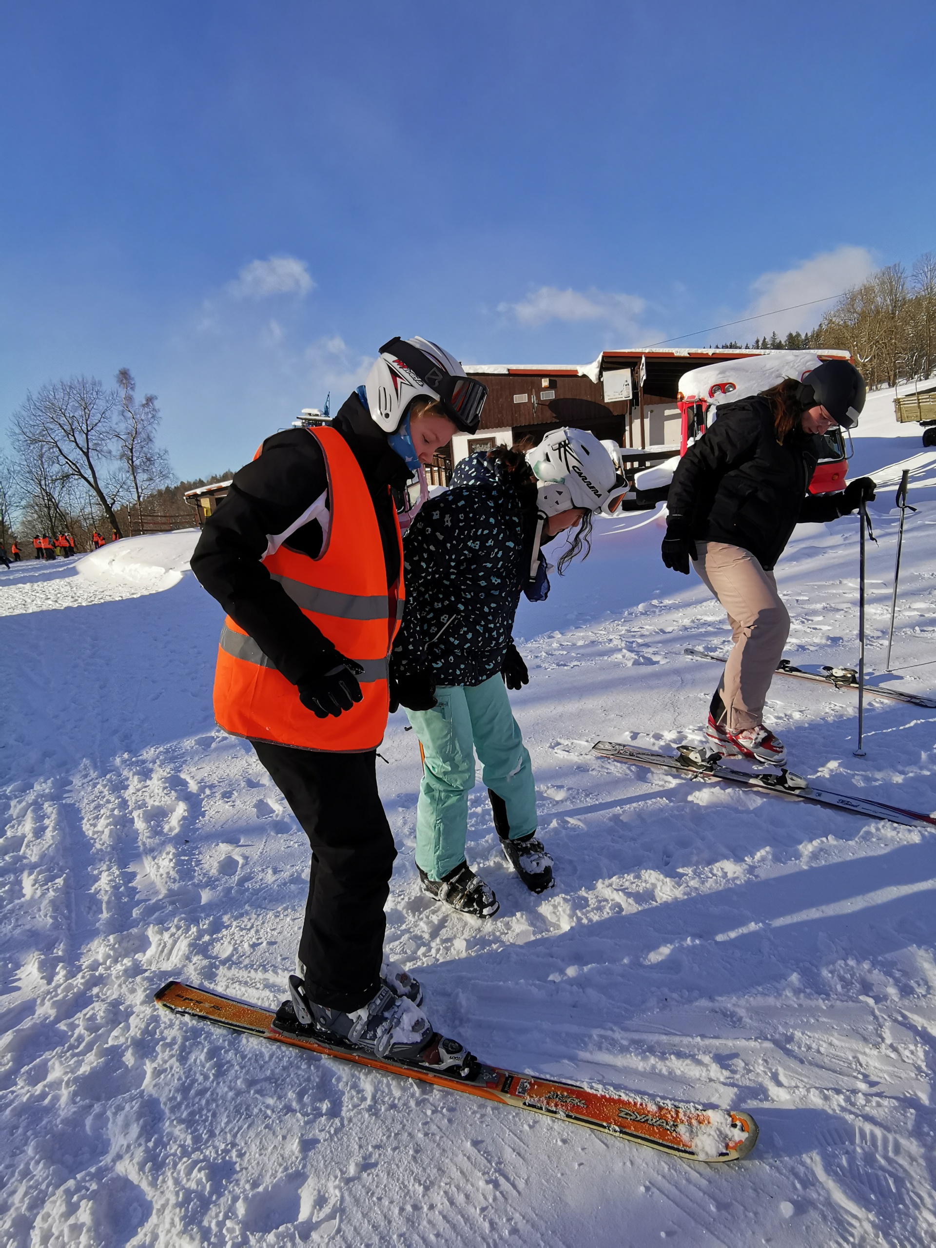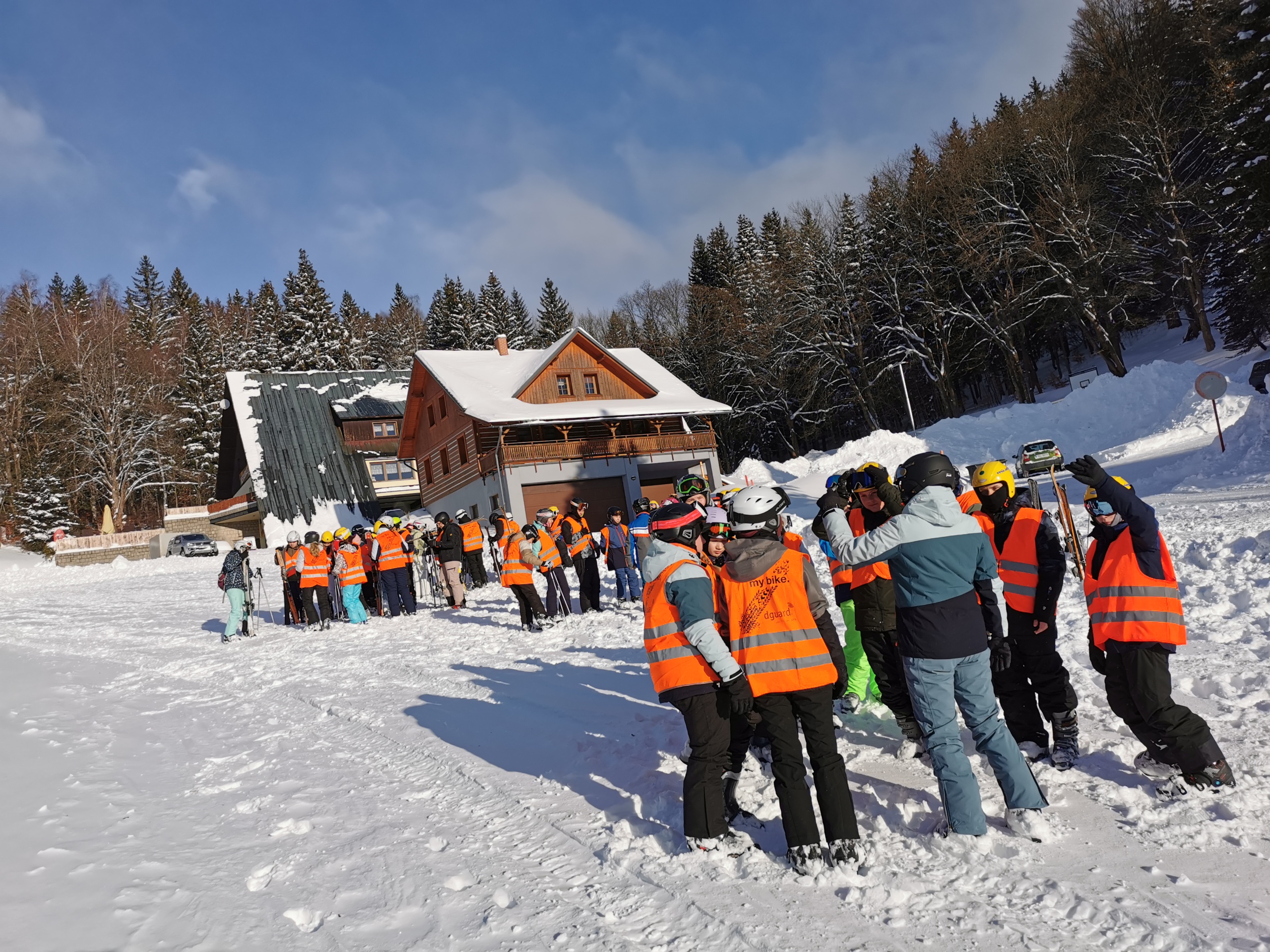 Untergebracht im praktischen Juniorhotel direkt am Hang, wurden wir mit vollwertiger böhmischer Küche verwöhnt. Der Sonntag stand ganz im Zeichen der Anreise und der Skiausleihe, die sich über mehrere Stunden hinzog denn auch das Skistiefelanziehen will gelernt sein. Am Montag wurden die Teilnehmenden in verschiedene Gruppen eingeteilt: vier Snowboard-Gruppen, eine große Gruppe fortgeschrittener Skifahrer und vier Gruppen für Anfänger auf Skiern.