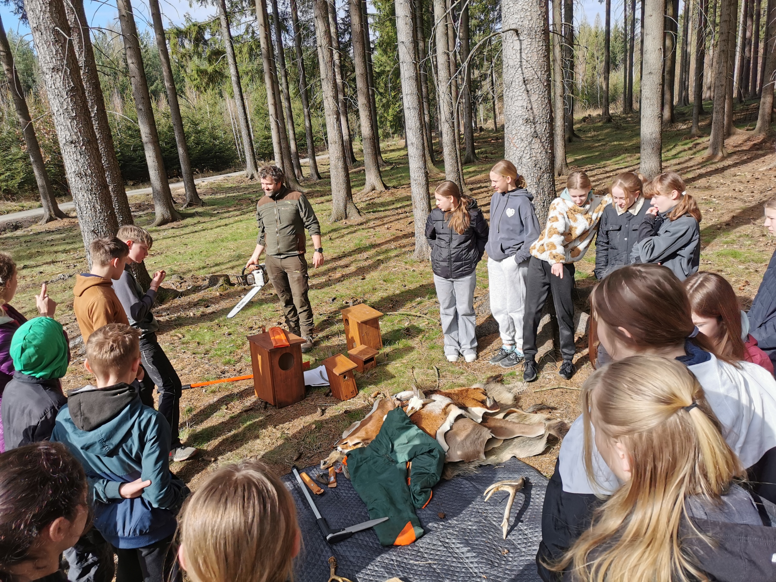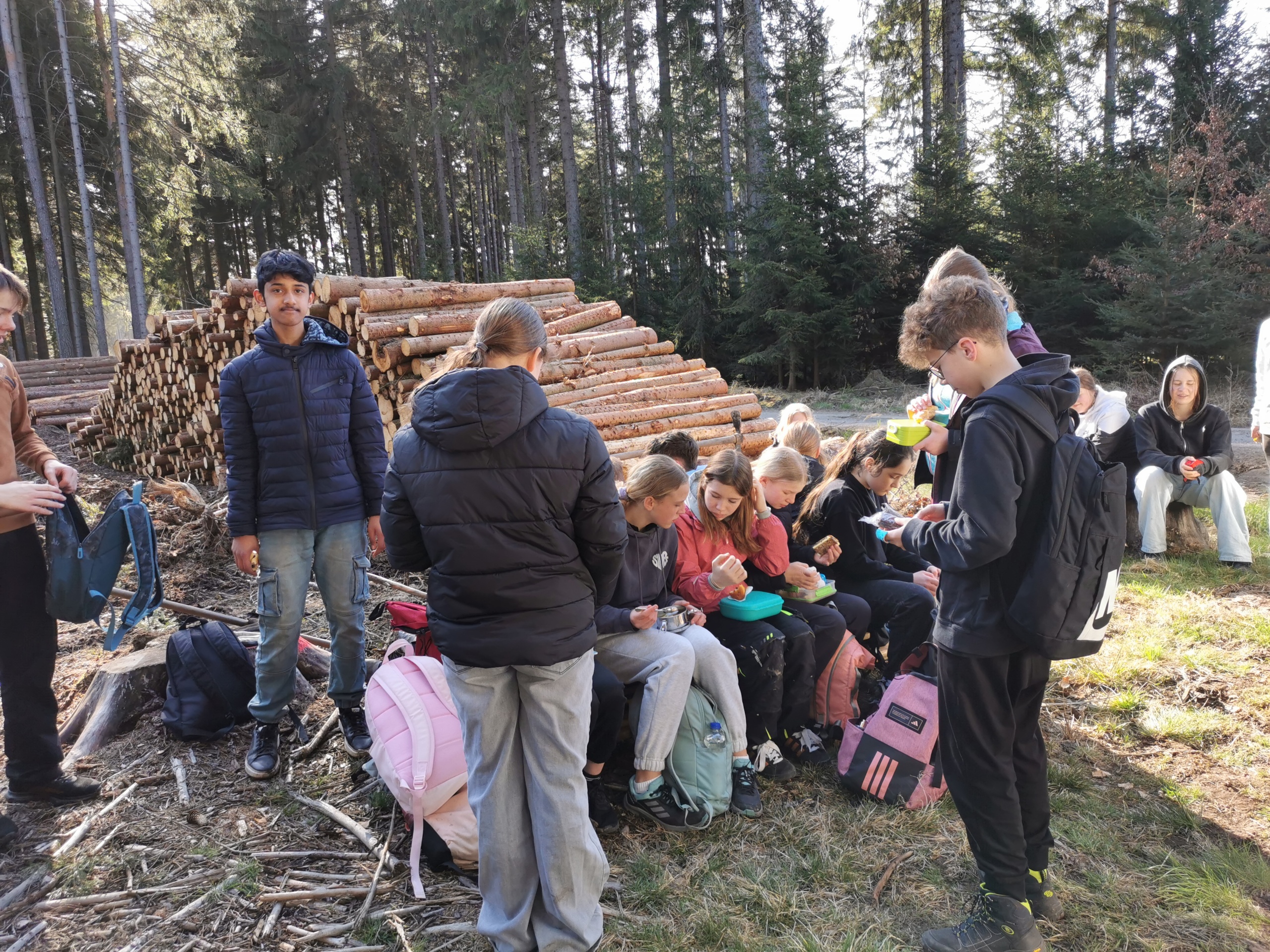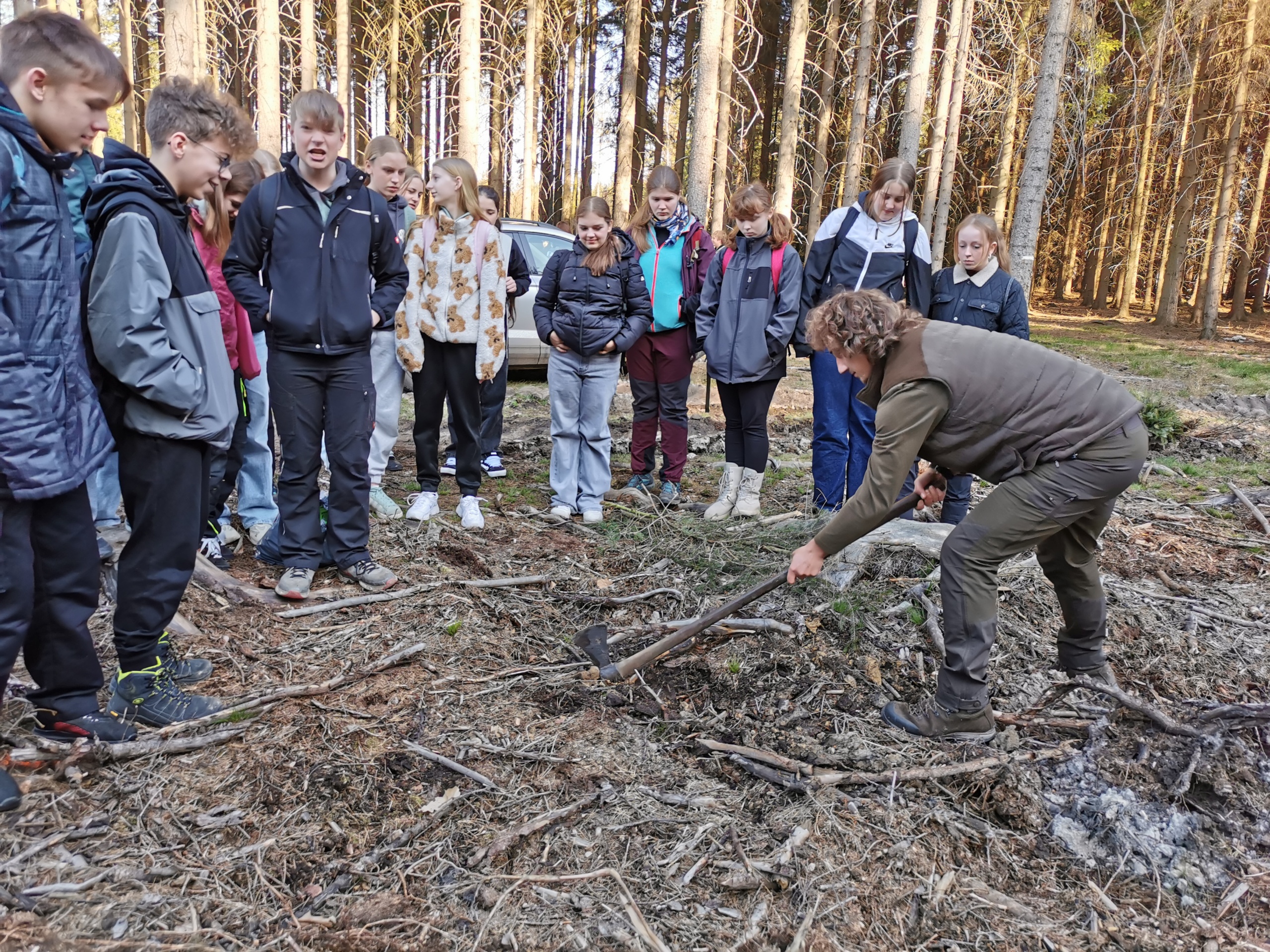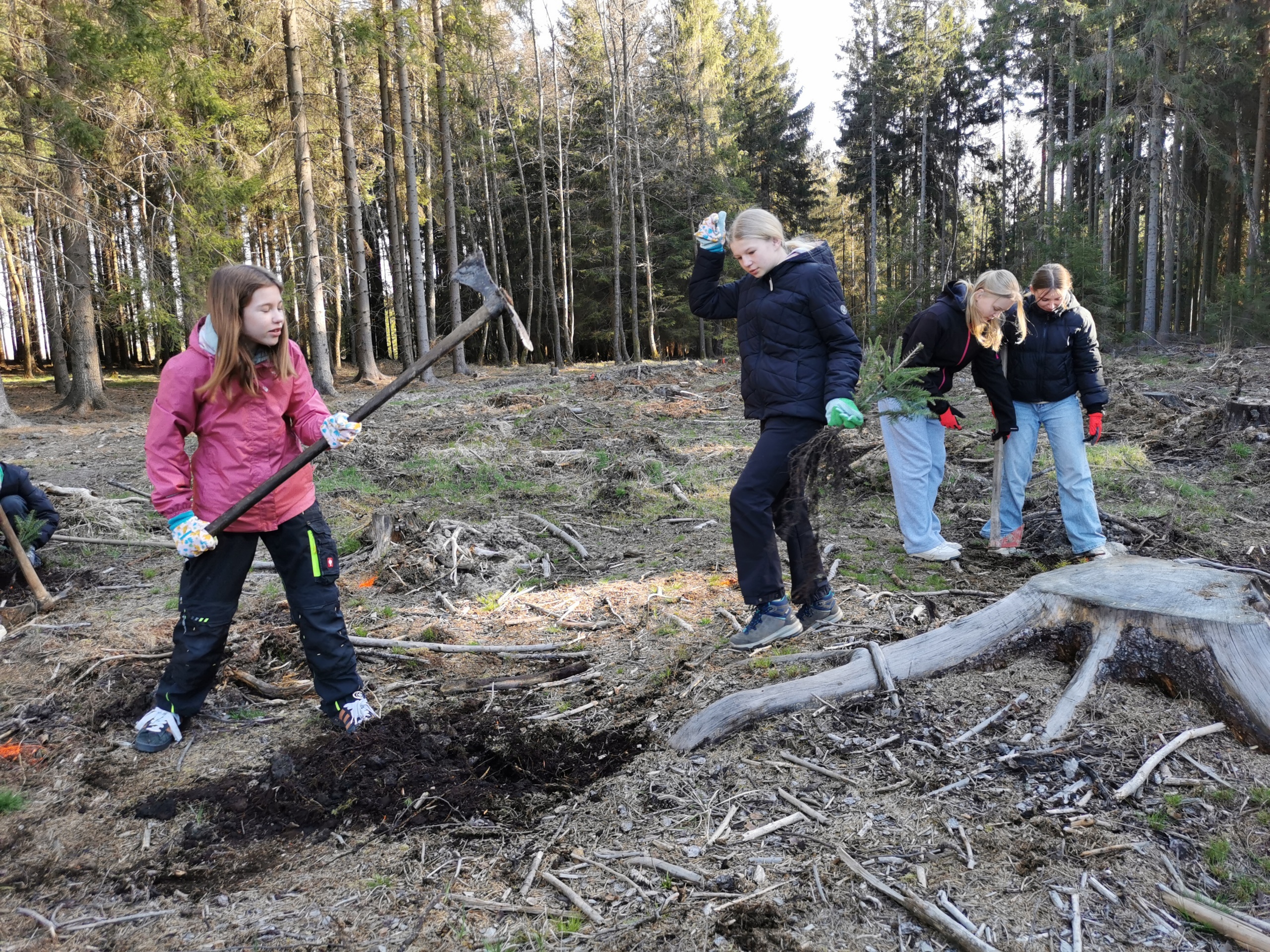 Im Rahmen eines waldpädagogischen Projekts erhielten die Schülerinnen und Schüler zunächst spannende Einblicke in die ökologische Bedeutung nachhaltiger Forstwirtschaft sowie in das Berufsbild des Waldarbeiters. Anschließend ging es an die praktische Arbeit: Auf einer zuvor abgeholzten Fläche – betroffen vom Borkenkäferbefall in einer ehemaligen Fichtenmonokultur – wurden Pflanzlöcher geschlagen und neue Setzlinge in die Erde gesetzt. Gepflanzt wurden zahlreiche Tannen, Buchen und – als besondere Ergänzung – Birnbäume entlang des Wegesrands, mit dem Ziel, einen stabilen und vielfältigen Mischwald entstehen zu lassen.